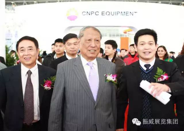 振威展覽股份董事長張學山陪同第九屆、十屆全國人大常委會副委員長成思危(中),中國工程院院士、中國海 洋石油有限公司原總裁周守為(左一)參觀cippe振威國際石油展